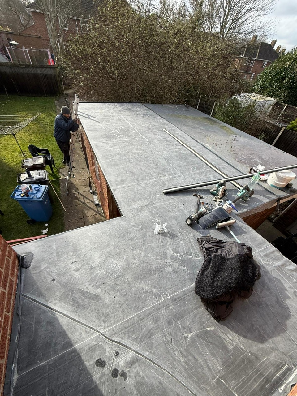 The EPDM membrane went on as a single, seamless sheet. That’s one of the biggest advantages of EPDM over older felt systems, no joints, no seams, no weak points for water to find its way through. The membrane was fully bonded to the OSB deck and dressed neatly at all edges and upstands.