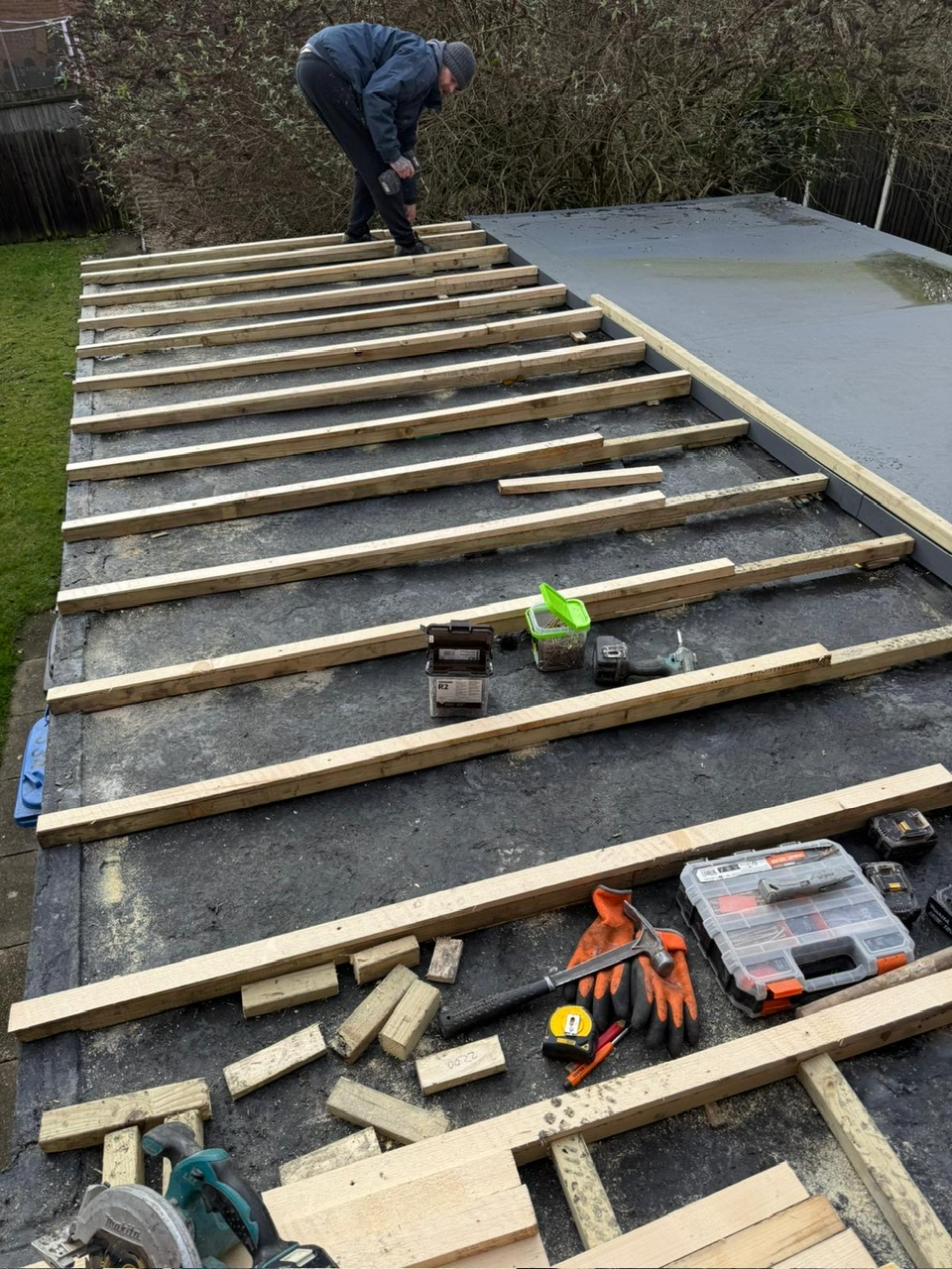 With the new framework in place, we laid new OSB boards across the full roof area. OSB gives a solid, stable base for the EPDM to bond to and ensures the finished surface is level and consistent.